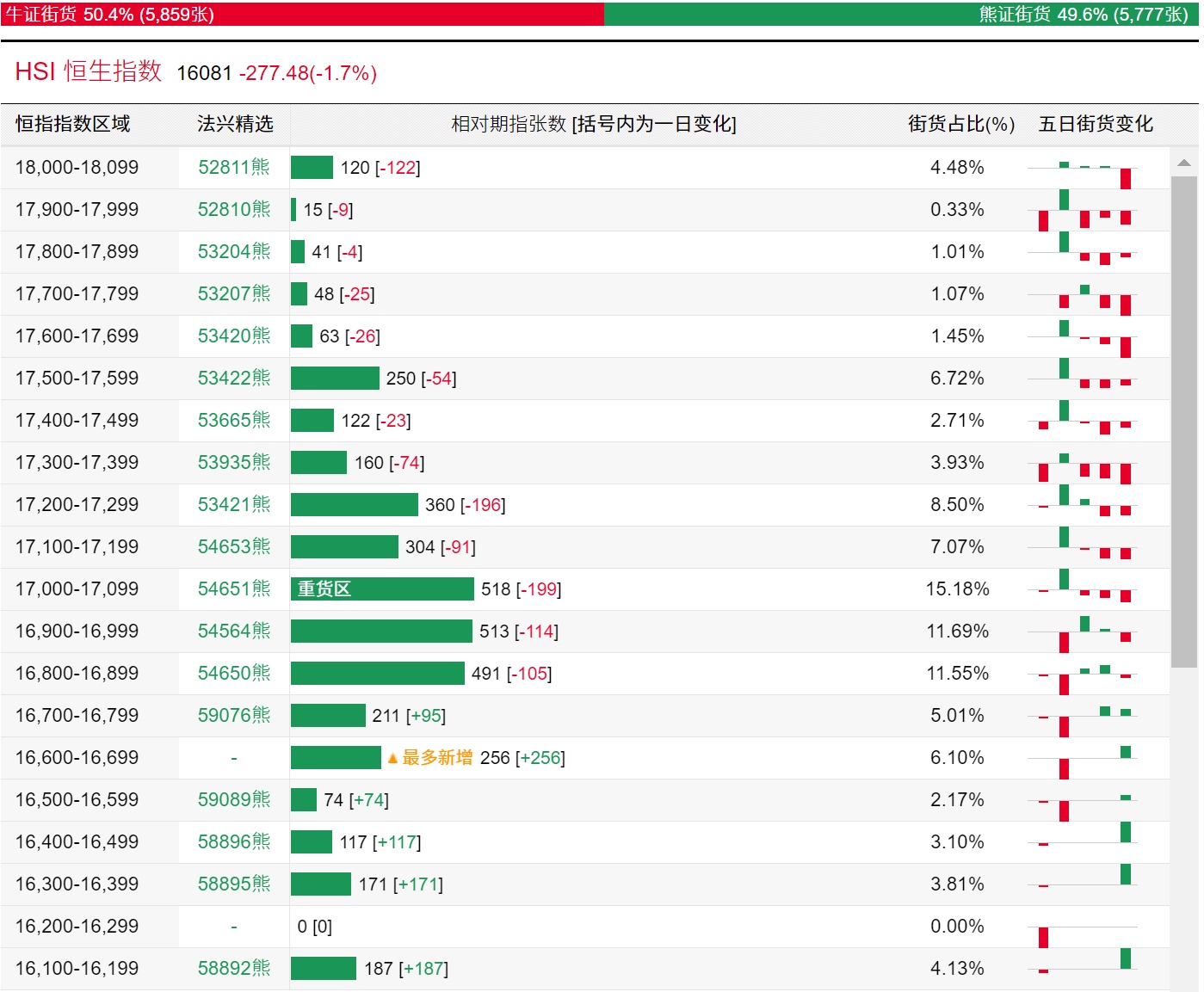 法兴恒指牛熊证街货分布图中的数据显示,熊证街货重货区在17000-17099区间,该区间最新熊证数量为518张,较上一交易日减少199张;最多新增在16600-16699区间,该区间最新牛证数量为256张,较上一交易日增加256张。
