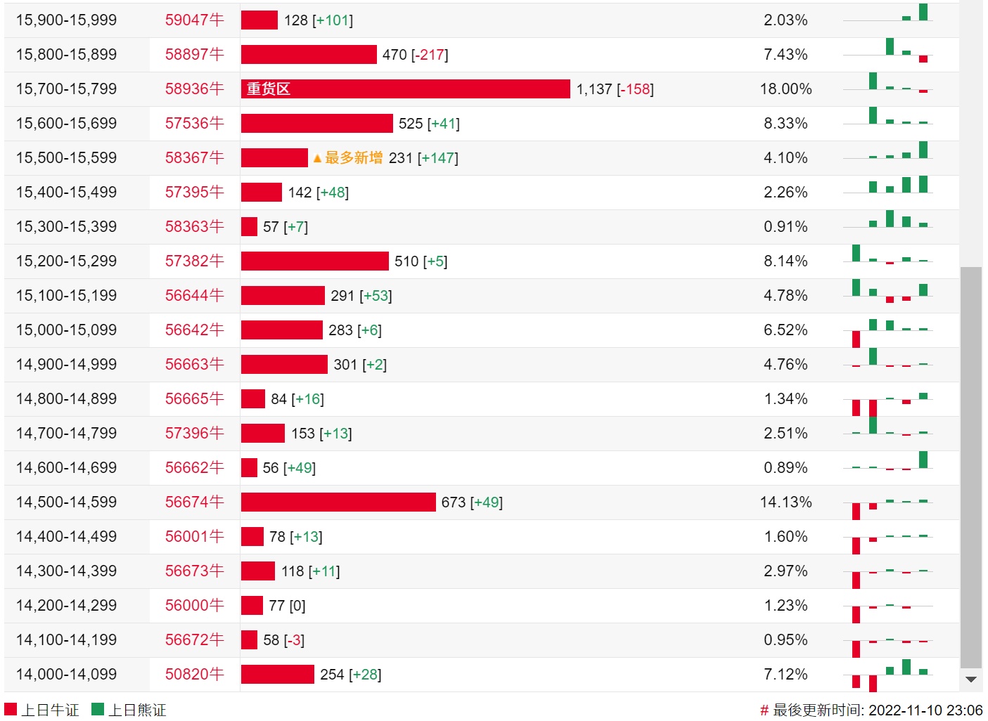 牛证街货重货区在15700-15799区间,该区间最新熊证数量为1137张,较上一交易日减少158张;最多新增在15500-15599区间,该区间最新熊证数量为231张,较上一交易日增加147张。