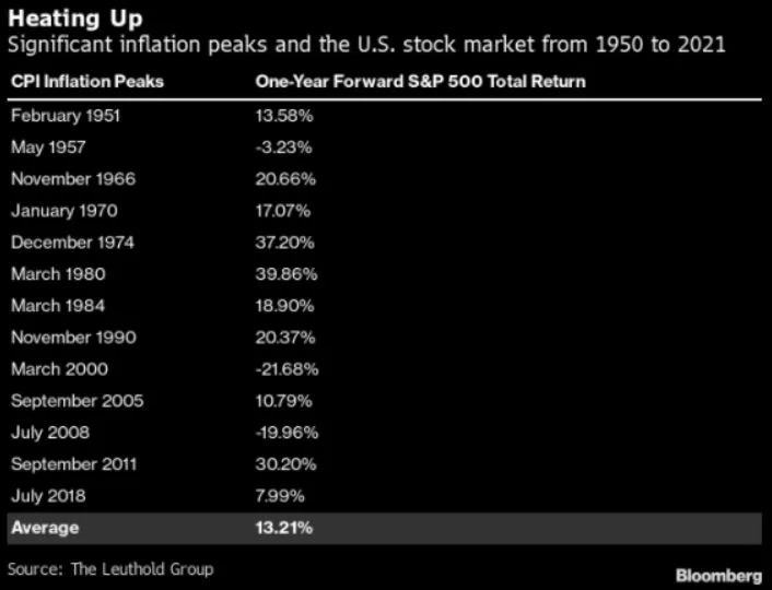 不出意外的是,美股的通胀上升时陷入困境,但在通胀见顶后就不是这样了。The Leuthold Group首席投资策略师Jim Paulsen指出,自1950年以来,标普500指数在13个主要通胀峰值之后的12个月的平均回报率为13%;其中,在10个通胀见顶后标普500指数上涨的情况中,标普500指数在此后12个月里的平均回报率为22%。