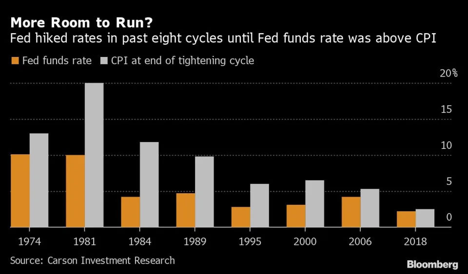尽管如此,Carson Investment Research的数据显示,在过去的8次加息周期中,美联储仍在继续提高利率,直到其高于CPI。市场预计,利率将在2023年上半年达到4.8%的峰值,略低于上周的5%以上,这意味着美联储仍有很多的加息空间来抑制居高不下的物价。