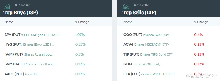 从持仓比例变化来看,前五大买入标的分别是:标普500指数ETF看跌期权(SPY.US,PUT)、债券指数ETF-iShares iBoxx高收益公司债看跌期权(HYG.US,PUT)、iShares罗素2000指数ETF看跌期权(IWM.US,PUT)、iShares罗素2000指数ETF看涨期权(IWM.US,CALL)、苹果看跌期权(AAPL.US,PUT)。
