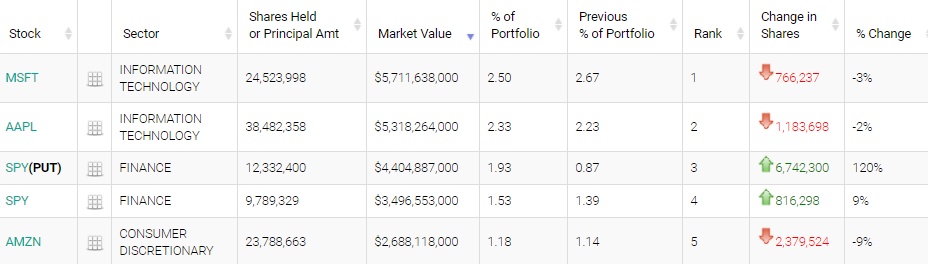 标普500指数ETF(SPY.US)、亚马逊(AMZN.US)分别位列第四和第五,持仓市值分别为34.97亿美元、26.88亿美元。