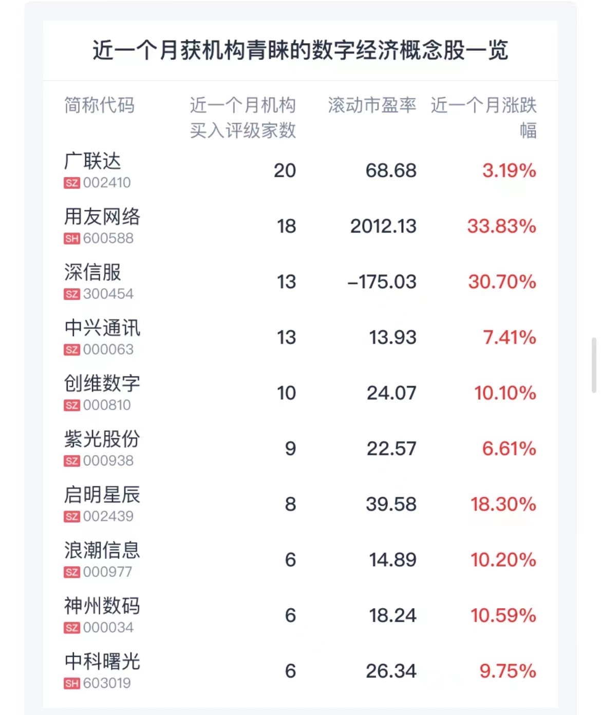 腾讯自选股梳理发现,A股数字经济概念股中近一个月获机构买入评级家数大于5家的有10股,其中广联达、用友网络等家数较为领先,分别为20、18家。