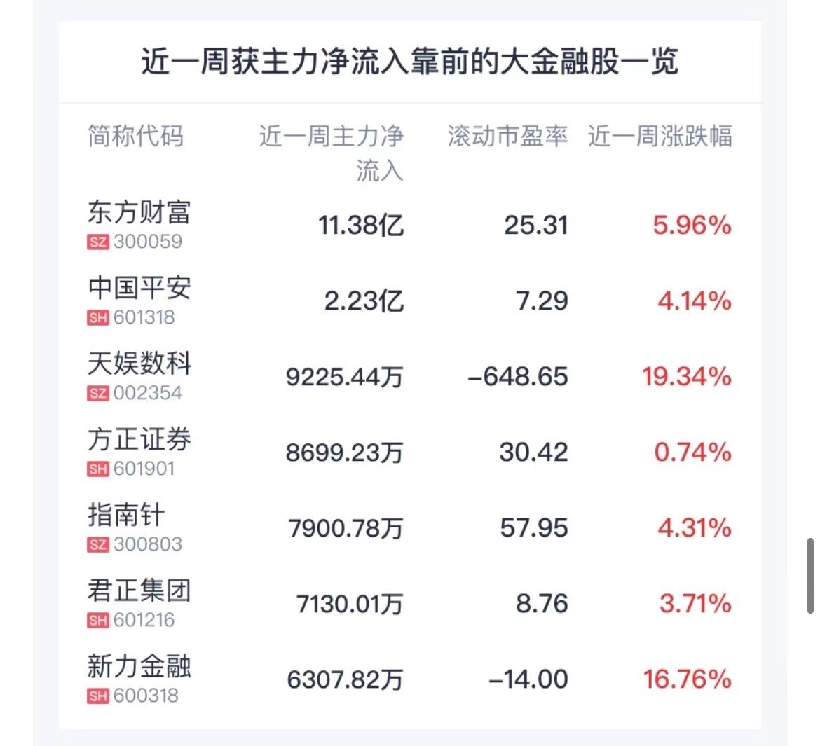 腾讯自选股梳理发现,大金融股中近一周获得主力资金净流入超5千万的有7个,其中东方财富、中国平安较为靠前,分别为11.38亿元、2.23亿元。