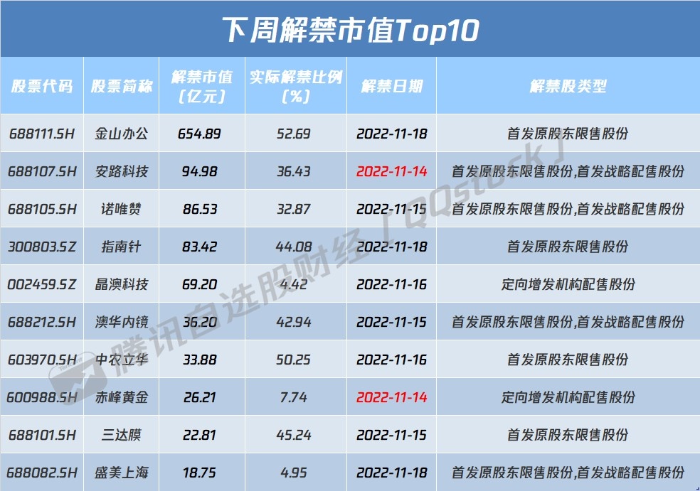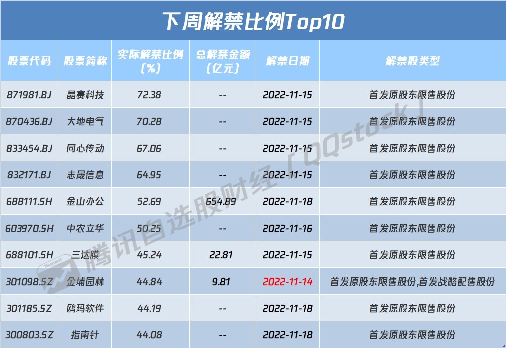 从解禁比例来看,下周晶赛科技解禁比例达72.38%,其次解禁比例居前的分别为大地电气和同心传动;从解禁市值来看,金山办公、安路科技、诺唯赞等股解禁市值居前。