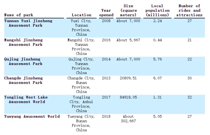 其中,云南玉溪游乐园为公司开业最早,也是面积相对最小的游乐园。相比之下,于2013、2017年开业的湖南常德及岳阳游乐园为公司贡献了不小的收入比重。