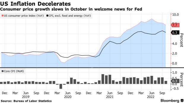 周四公布的数据显示,美国10月CPI同比上涨7.7%,低于市场预期的8%,时隔7个月再度回落至8%以下,为2022年1月以来最小涨幅;10月CPI环比上涨0.4%,低于市场预期的0.6%;10月核心CPI(不包括食品和能源)同比增长6.3%,同样低于市场预期的6.5%。