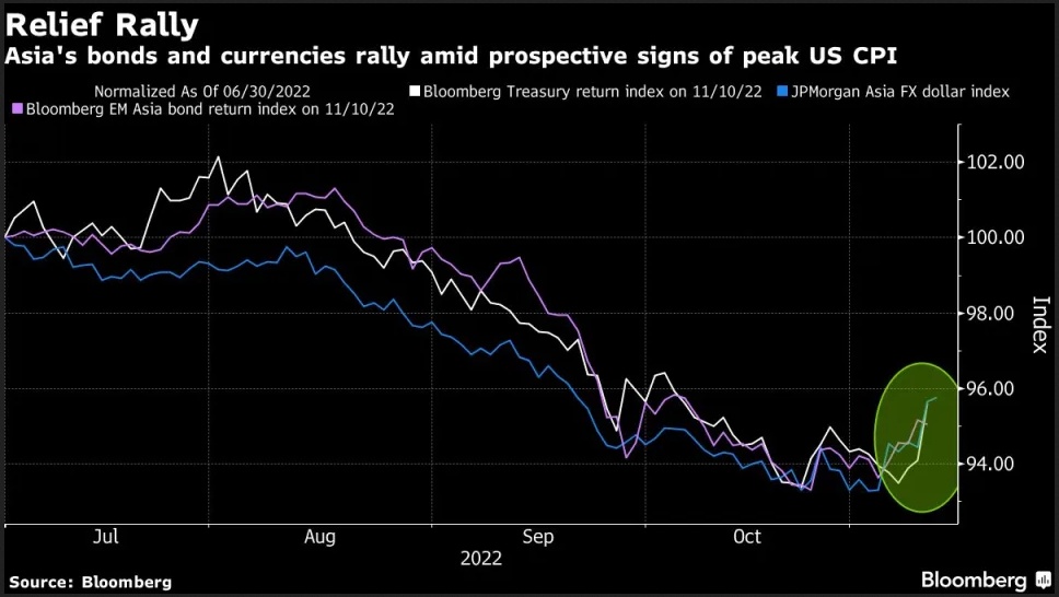 美国10月CPI数据超预期放缓显示通胀可能见顶,强化了美联储即将转变其激进加息政策的市场预期,市场对此倍感振奋。在周四美股暴力反弹的带动和对美联储将转向鸽派的预期下,亚洲市场周五一片向好。截至发稿,韩国KOSPI指数涨3.39%,日经225指数涨近3%,越南VN30指数涨超2%。除了股市之外,债市和汇市同样表现不俗。债市方面,韩国和泰国的10年期国债基准收益率均下降了至少15个基点;汇市方面,韩元与泰铢兑美元汇率的涨幅均超过2%。