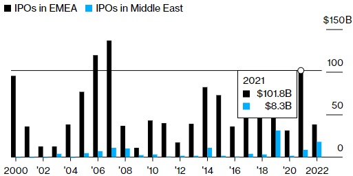 尽管由于市场持续下跌和高通胀,包括欧洲在内的全球大多数交易所市场的IPO融资额已从去年创纪录的水平开始大幅下滑,但中东地区的情况则完全不同。到2021年和今年年初,油价飙升,加上市场投资资金流入该地区,随着政府为摆脱石油转型的公司出售股份帮助提供资金,2021年该地区的IPO融资额开始反弹。