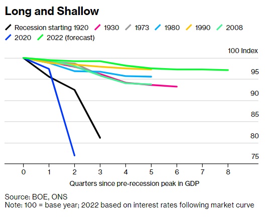 自去年12月以来已进行8次加息的英国央行表示,经济衰退是控制两位数通胀的必然代价。根据英国央行的预测数据,经济衰退可能会持续到2024年中期左右,这将是自1920年以来持续时间最长的一次。