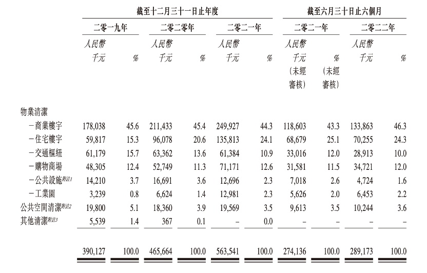 进一步细分,升辉清洁的物业清洁业务又可以拆分为商业楼宇、住宅楼宇、交通枢纽、购物商场、公共设施、工业园。其中,商业楼宇为公司物业清洁业务里的主要收入贡献项,该业务的收入增速也较为稳定。2019年-2021年,该业务营收分别为1.78亿元、2.11亿元、2.50亿元,占比为45.6%、45.4%、44.3%。
