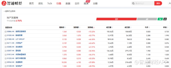 港股市场方面,内房股板块在这波上涨中一马当先,其中旭辉控股集团(00884)涨超76%,新城发展(01030)涨超53%,龙光集团(03380)涨41.51%,碧桂园(02007)涨近35%,成为行情反转的排头兵。受房地产板块带动影响,物管、家装、建材等板块也随之走高。
