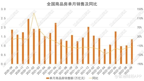 据国家统计局、观点指数数据,9月,单月商品房销售金额环比涨幅较大,已然呈现出复苏迹象。9月商品房销售金额13510亿元,同比下降14.2%,环比上升33.7%,商品房销售同比跌幅降至年内最低水平。