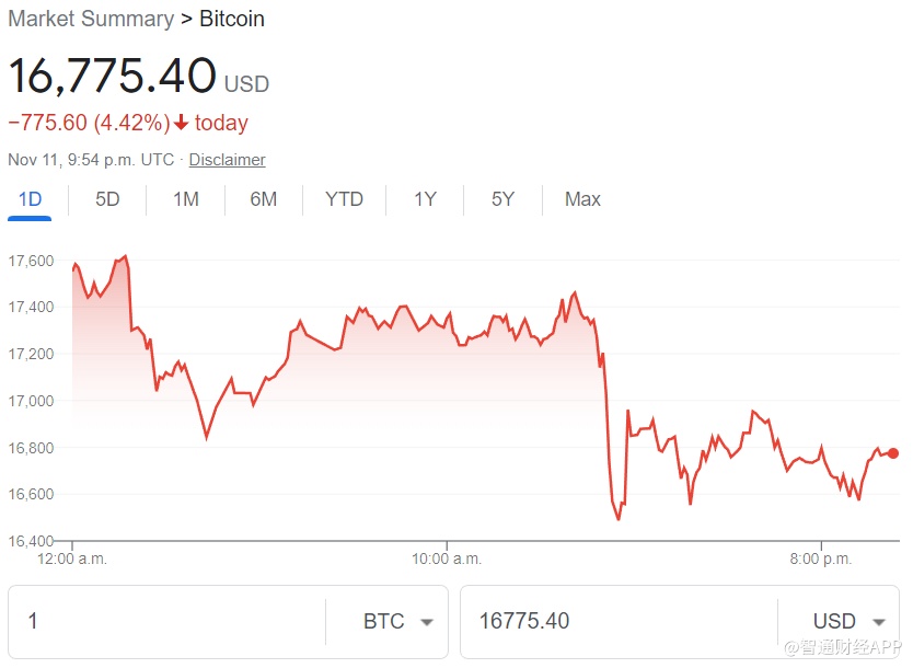 智通财经APP获悉,周五,比特币和其他加密货币下跌,消息指出,加密货币交易所FTX及其附属公司已经开始申请破产保护,创始人Sam Bankman-Fried将卸任CEO。比特币的价格在过去24小时内下跌超4%,至16775美元,之前的交易价格约为1.75万美元。