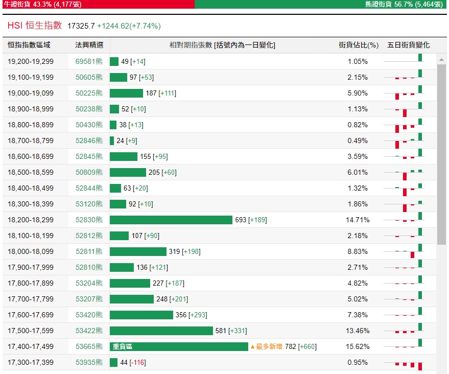 法兴恒指牛熊证街货分布图中的数据显示,熊证街货重货区与最多新增都在17400-17499区间,该区间最新熊证数量为782张,较上一交易日增加660张。