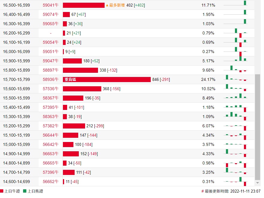 牛证街货重货区在15700-15799区间,该区间最新熊证数量为846张,较上一交易日减少291张;最多新增在16500-16599区间,该区间最新熊证数量为402张,较上一交易日增加402张。
