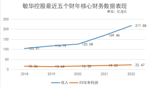 业绩表现来看,最近五个财年敏华控股经历了核心财务数据的爆发式增长。收入由2018财年的103.91亿港元增加至2022财年的217.88亿港元,收入成功翻番;同期,归母净利润由15.36亿港元提升至22.47亿港元,对应期间复合年增长率约为10%。