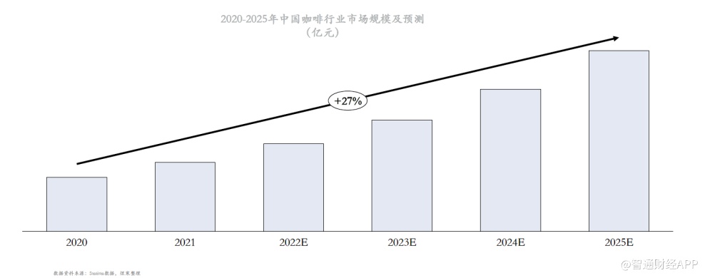 行业数据亦可作为佐证,以咖啡市场为例,根据煜寒咨询的资料,2020年中国咖啡行业市场规模突破3000亿元,2021年达到3817亿元,预计至2025年时可扩张至万亿规模,期间对应复合年增长率高达27%。