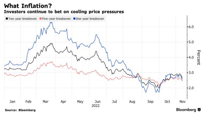 例如,一项衡量市场通胀预期的指标,即未来的价格增长将趋向于接近美联储2%的目标,就表明了市场的乐观情绪。目前,交易员预计借贷成本将在明年见顶,同时消化了美联储12月加息50个基点的预期。