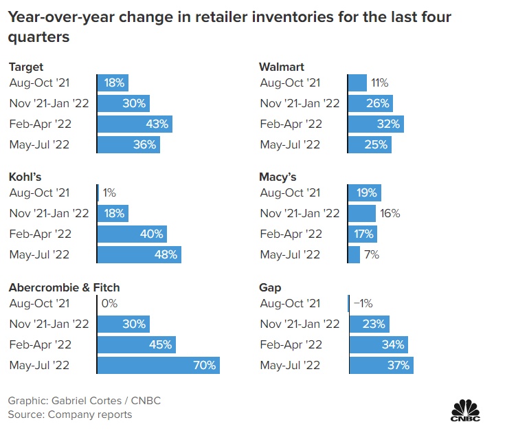 此前,在截至4月30日的第一季度,沃尔玛和塔吉特等零售商的库存水平大幅飙升,令投资者感到震惊。其中,塔吉特两次下调销售预期,一次是在5月,一次是在6月,表示将取消订单、降价并采取其他重大措施清理混乱。