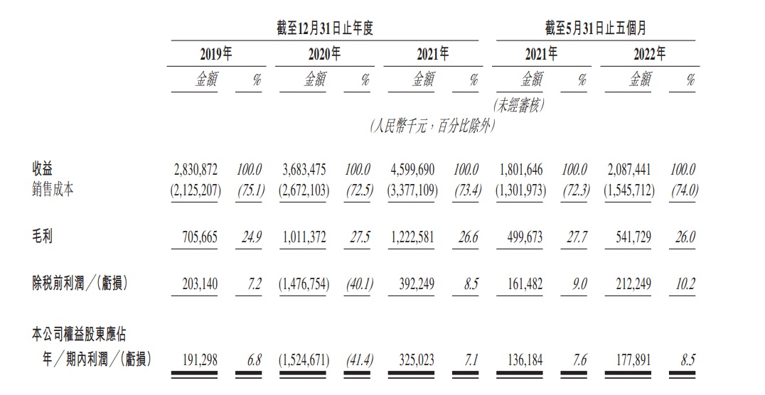 据披露,2019年、2020年、2021年及截至2021年及2022年5月31日止五个月,花房集团的收益分别为28.31亿元(人民币,下同)、36.84亿元、46.00亿元、18.02亿元、20.87亿元。