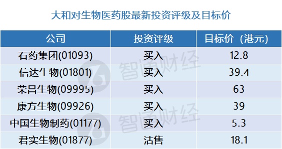 智通财经APP获悉,大和发布研究报告称,首予中国生物医药行业“正面”评级,首选石药集团(01093),因认为其风险回报最好,同时视信达生物(01801)为中国下一代生物医药代理人。基于增长乏善可陈、抗病毒药物VV116存不确定性及现金消耗率,予君实生物(01877)评级“沽售”。