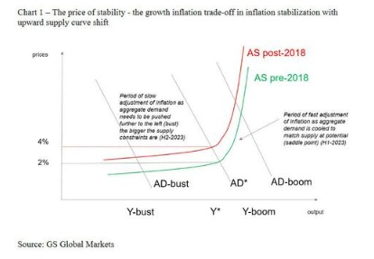 将经济放缓至潜在水平将无法满足2%的通胀目标。随着供给曲线在负产出缺口水平趋平,将通胀率降至2%的产出和社会成本不成比例地增加,为通胀目标水平修正辩论创造了政治背景。