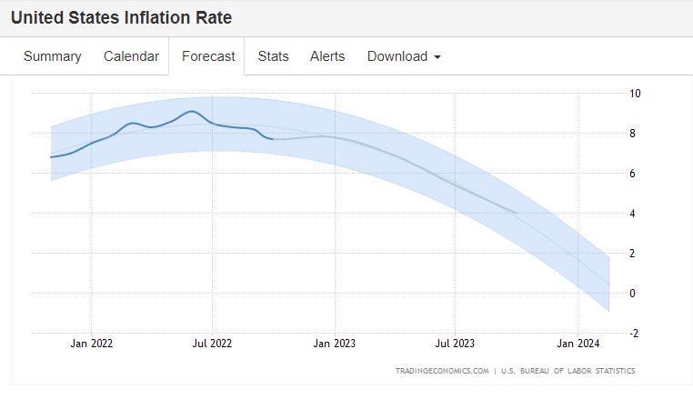根据数据统计平台Trading Economics 的全球宏观预测模型和汇编的分析师普遍预期,预计到本季度末,美国的通货膨胀率将在7.7%-7.80%附近;Trading Economics预测数据还显示,从长期来看,美国通胀率预计将在2023年年底保持在1.90%—2%左右,远低于目前的高水平。
