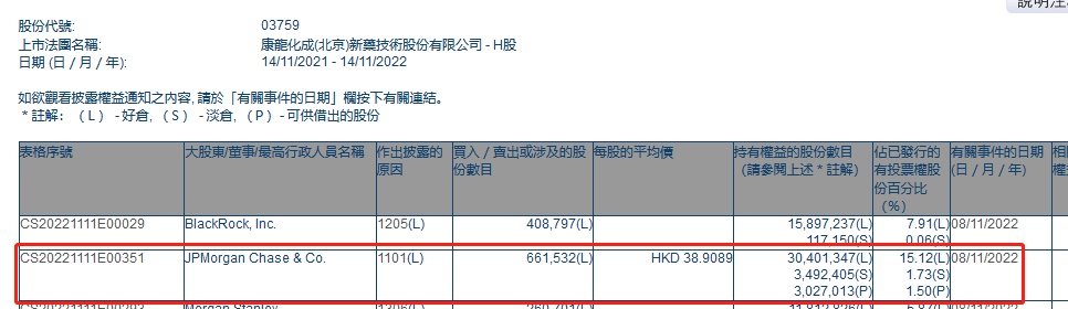 智通财经APP获悉,香港联交所最新资料显示,11月8日,小摩增持康龙化成(03759)66.1532万股,每股作价38.9089港元,总金额约为2573.95万港元。增持后最新持股数目约为3040.13万股,最新持股比例为15.12%。