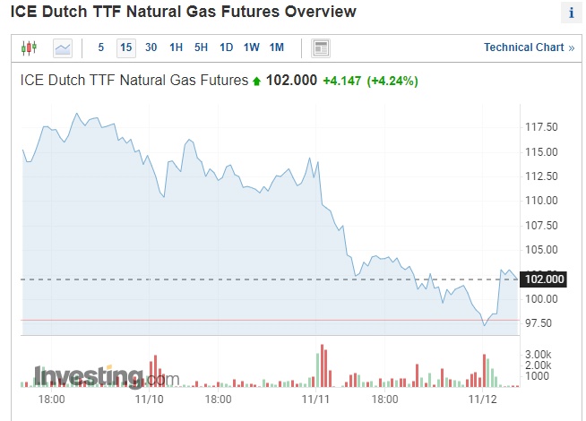 德意志银行分析师在一份报告中表示,由于10月的天气非常温和,当月的天然气需求比正常水平低20%以上,预计2022年冬季的情况会比较乐观。虽然未来一年液化天然气的供应存在一些不确定性,但这是一个积极的信号。