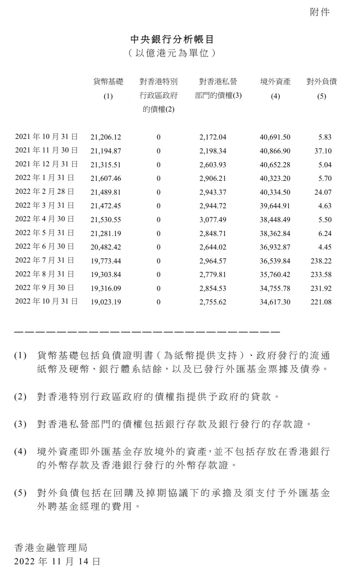 智通财经APP获悉,11月14日,香港金融管理局(金管局)公布外汇基金在2022年10月底的主要分析帐目。在10月份,外汇基金的境外资产减少138亿港元,至34617亿港元。