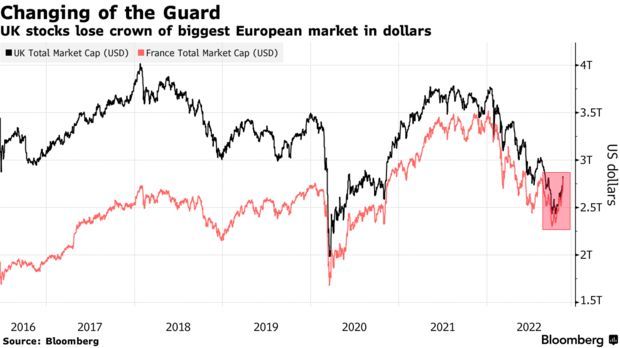 由于对经济增长的担忧拖累了英国资产、再加上中国疫情防控政策的调整提振了法国奢侈品股,英国将“欧洲最大股票市场”这一头衔拱手让给了法国。汇率变动也是部分原因。英国前首相特拉斯在9月提出的大规模无资金支持的减少计划以及由此造成的金融市场动荡令英镑兑美元汇率跌至1985年以来的最低水平。