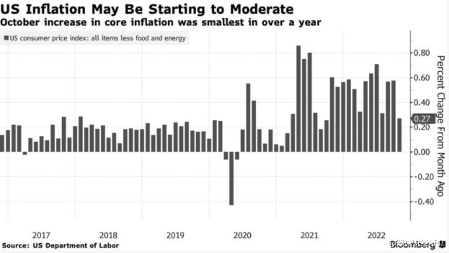 美国劳工部上周发布的报告显示,10月份,通胀降温幅度超过预期,消费者价格指数(CPI)较上年同期增长7.7%,而前月的增幅为8.2%。但官员们强调,他们需要看到一系列较低的月度读数,才能相信价格压力正在回落与美联储2%目标相一致的水平。