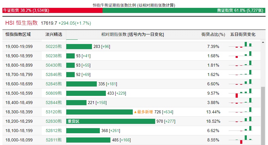 法兴恒指牛熊证街货分布图中的数据显示,熊证街货重货区在18200-18299区间,该区间最新熊证数量为970张,较上一交易日增加277张;最多新增在18300-18399区间,该区间最新牛证数量为726张,较上一交易日增加634张。