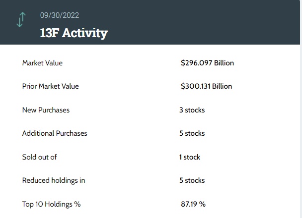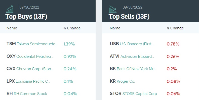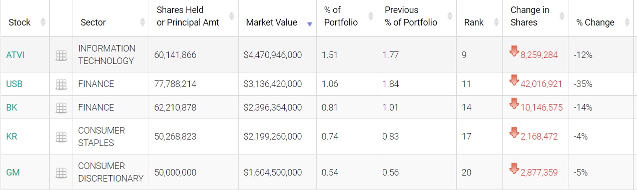 前五大卖出标的包括:美国合众银行(USB.US)、动视暴雪、纽约梅隆银行(BK.US)、克罗格(KR.US)以及STORE Capital Corp(STOR.US)。