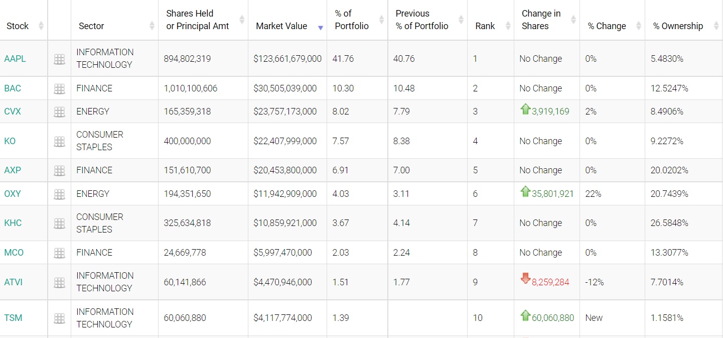 前十大重仓股中,其他依次是今年以来屡获股神增持的西方石油(OXY.US)、卡夫亨氏(KHC.US)、穆迪(MCO.US)、动视暴雪(ATVI.US)以及台积电(TSM.US)。其中,西方石油持仓数量较上季度环比大幅增加22%,动视暴雪较上季度减少12%,芯片制造巨头台积电为股神新建持仓,共计约6006万股,持仓市值达41亿美元,占投资组合比例为1.39%。