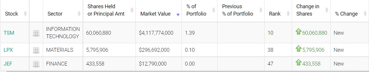 从持仓比例变化来看,前五大买入标的分别是:台积电、西方石油、雪佛龙、Louisiana-Pacific(LPX.US)、RH(RH.US)。台积电与Louisiana-Pacific为新建仓股票。