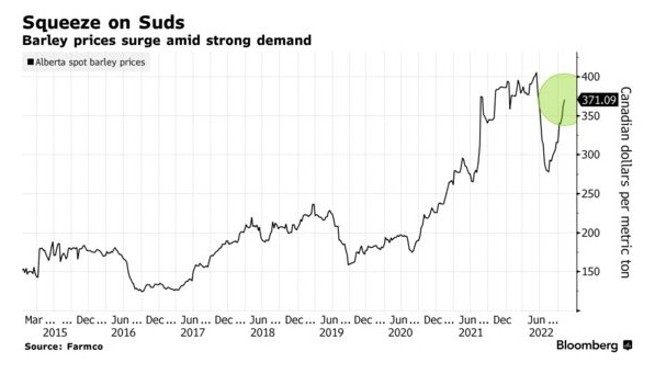 啤酒酿造商依赖麦芽来为啤酒调味,加拿大部分地区的大麦价格自8月份以来飙升了30%以上。加拿大麦芽大麦技术中心董事总经理Peter Watts表示,加拿大大麦价格正接近2021年创下的历史高点,原因是啤酒制造商和牲畜饲养者试图补充去年干旱后减少的供应。