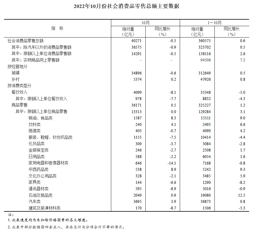 10月份,社会消费品零售总额40271亿元,同比下降0.5%。其中,除汽车以外的消费品零售额36575亿元,下降0.9%。