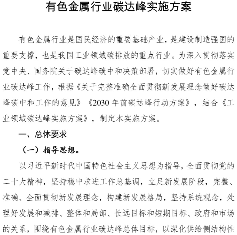 三部门关于印发有色金属行业碳达峰实施方案的通知