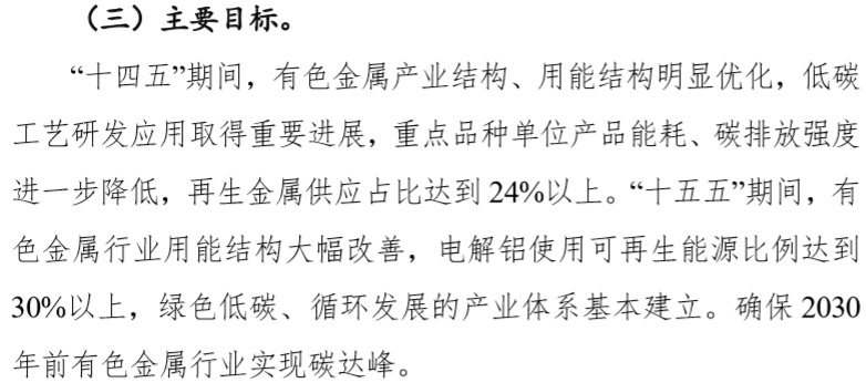 智通财经APP获悉,11月15日消息,工信部、国家发改委、生态环境部三部门关于印发有色金属行业碳达峰实施方案的通知。方案指出,“十四五”期间,有色金属产业结构、用能结构明显优化,低碳工艺研发应用取得重要进展,重点品种单位产品能耗、碳排放强度进一步降低,再生金属供应占比达到24%以上。“十五五”期间,有色金属行业用能结构大幅改善,电解铝使用可再生能源比例达到30%以上,绿色低碳、循环发展的产业体系基本建立。确保2030年前有色金属行业实现碳达峰。