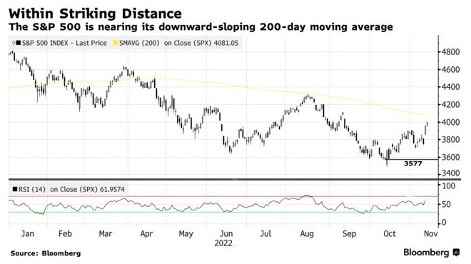 而上周四由CPI推动的反弹让投资者看到希望。随着标普500指数接近200日移动平均线,最新一轮反弹可能还有更大的空间。目前,标普500指数较10月中旬的低点上涨了近11%。