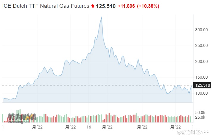 智通财经APP获悉,周二,欧洲天然气价格上涨,原因是美国一个关键液化天然气(LNG)出口设施延长停运时间加剧了供应担忧,以及欧洲天气转冷。截至发稿,欧洲基准荷兰近月天然气价格上涨10.38%,至每兆瓦时125.51欧元,前一交易日上涨20%。