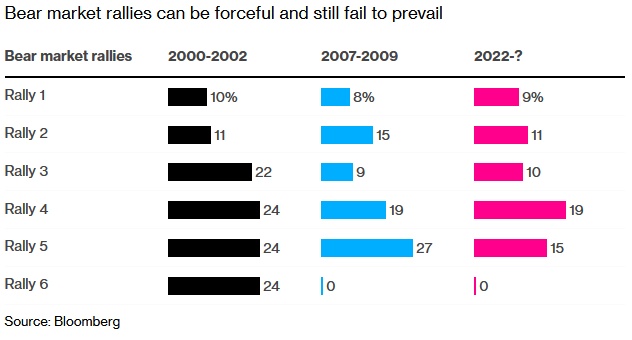 历史数据也表明,在下跌的市场中,反弹可能只是暂时的、并造成更大范围内情况出现好转的错误印象。在互联网泡沫破裂和全球金额危机这两次大熊市中都出现了20%乃至更大幅度的中期反弹,但之后市场又恢复了下跌。