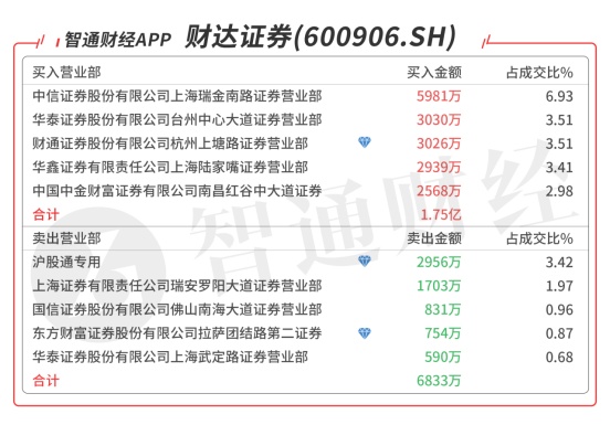 财达证券(600906.SH):多主力现身龙虎榜,沪股通卖出2956万元,买一是知名游资古北路的席位买入5981万元,买三是知名游资上塘路的席位买入3026万元,买四是知名游资的席位买入2939万元,当日净买入1.07亿元,该股今天放量突破,有望冲击年线。