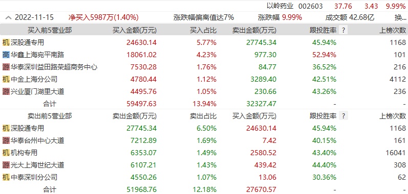智通财经APP获悉,继11月14日涨停后,11月15日,以岭药业(002603.SZ)再度涨停,报37.76元/股,成交额42.68亿元,换手率8.39%,总市值630.86亿元,两个交易日市值大涨约110亿元。今日,以岭药业因属于当日涨幅偏离值达7%的证券而登上龙虎榜,值得注意的是,以岭药业已连续三日登龙虎榜榜单。