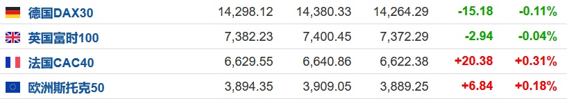 2. 截至发稿,德国DAX指数跌0.11%,英国富时100指数跌0.04%,法国CAC40指数涨0.31%,欧洲斯托克50指数涨0.18%。