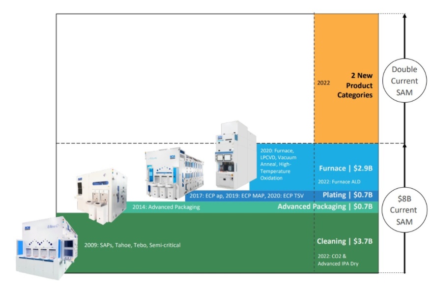 此后,为提升公司的发展潜力,打开成长天花板,ACM Research提出了平台化发展策略,即从清洗设备向其他种类的半导体设备扩张。截止目前,除了清洗设备外,ACM Research已有用于芯片制造的前道铜互连电镀设备、立式炉管系列设备(潜在应用领域包括了LPCVD(低压化学气相沉积)、氧化、退火、ALD(原子层沉积))、无应力抛光设备、后道先进封装的电镀设备,以及用于先进封装的湿法刻蚀设备、涂胶设备、显影设备、去胶设备等。这就意味着ACM Research已横跨晶圆制造和先进封装两大赛道。