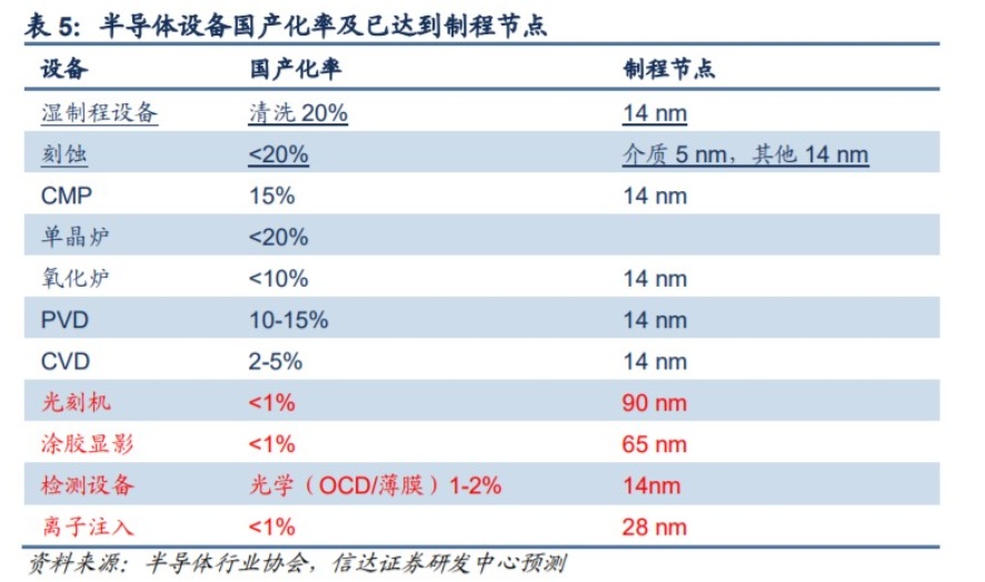 据信达证券预计,若中国的半导体设备要达到自主可控的程度,产业链各环节的国产化率需要达到60%左右的水平。但截止目前,仅有清洗设备的国产化率达到了20%,刻蚀、单晶炉仍低于20%,CMP、PVD两类设备则低于15%,其他环节设备的国产化率则处于更低水平。显然,当前中国的国产化仍处于初期阶段。