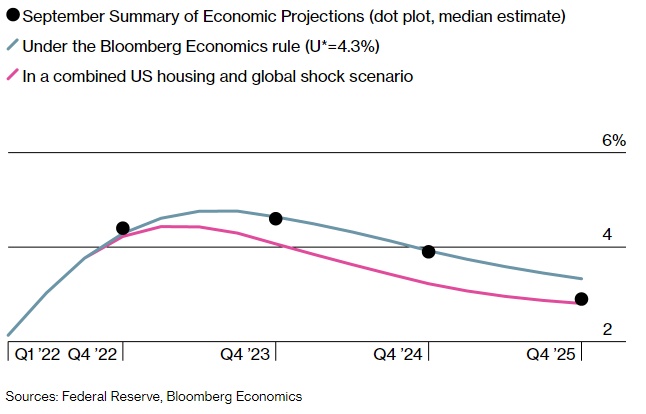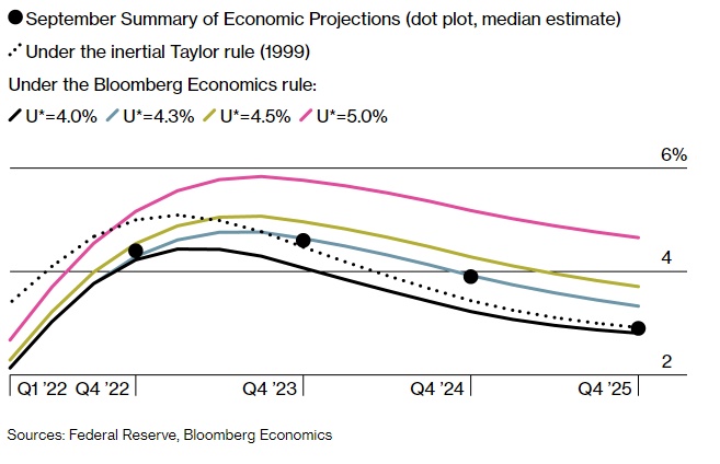 在9月份的利率决议上,美国联邦公开市场委员会(FOMC)的点状图显示,尽管美国经济增长前景恶化,但加息轨迹仍在上升。对这种反常现象的一个简单解释是,该委员会对u*的估计从传统的4%上升了。据悉,u*也被称为自然失业率(NAIRU),即与物价稳定相关的失业率。